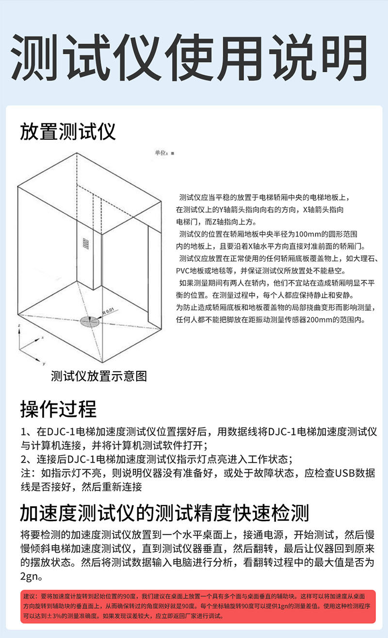 DJC-1電梯加速度測(cè)試儀主要用于記錄電梯的啟動(dòng)、制動(dòng)及運(yùn)行過程中的加速度及振動(dòng)性能,該儀器操作簡(jiǎn)單,可按照以下程序進(jìn)行。